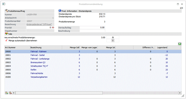 Hier kann - wenn es sich bei dem Artikel um einen weiteren Produktionsartikel handelt - die Menge eingegeben werden, die vom Lager genommen wird. Wird hier eine Menge eingetragen, dann wird diese Menge nicht nochmals produziert (mit allen Komponenten vom Lager abgebucht).