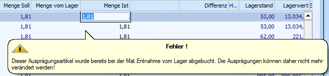 Wenn Ausprägungsartikel bei einem Arbeitsschritt vorher teilentnommen wurden, können bei der Endmeldung nur diese Ausprägungen verwendet werden. Bei einem Klick auf das IST-Mengenfeld vom Ausprägungsartikel erscheint daher die Meldung: