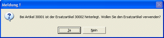 Wird die Meldung mit JA beantwortet, dann wird der Ersatzartikel geöffnet. Wird die Meldung mit NEIN beantwortet, dann wird der Artikel geöffnet, der ursprünglich eingegeben wurde.