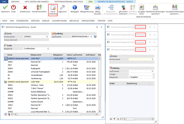 Sollten mehrere Zielbelege notwendig sein, so können weitere Fenster mit Hilfe des Buttons "neuer Beleg" (bis maximal 10 Belege gleichzeitig) geöffnet werden.