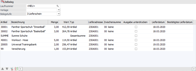 Die Spalten "Lieferadresse", "Zwischensumme" und "Ausgabe unterdrücken" können bearbeitet werden. In der Spalte "Lieferadresse" wird beim Verschieben von Zeilen aus dem Quellbeleg die Lieferadresse aus dem Quellbeleg übernommen; beim Kopieren von Zeilen wird als Lieferadresse jene des Zielbeleges vorgeschlagen.