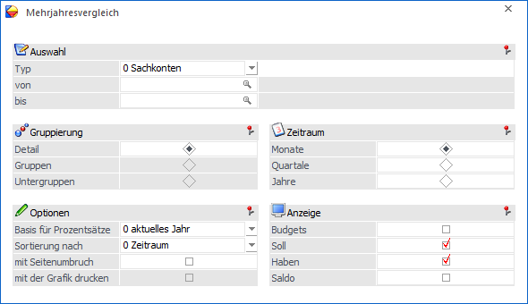 Die Ausgabe des Mehrjahresvergleichs kann nach den folgenden Kriterien eingeschränkt bzw. definiert werden: