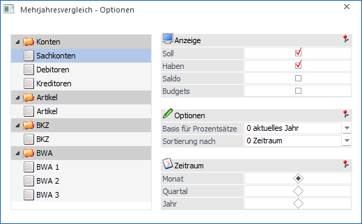 ü Im Menüpunkt "Mehrjahresvergleich" werden die Einstellungen im Fenster mit denen aus den Optionen vorbelegt, können dort aber für die Auswertung geändert werden.