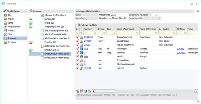 Um das Wechseln der Programme zu vermeiden, steht der Objekt-Typ "Adressen" zur Verfügung. Innerhalb dessen werden die Merklisten im Kontext einer Kampagne dargestellt, d.h. es werden nur noch "Adressen" dargestellt und Funktionen wie Auswahl Ansprechpartner stehen zur Verfügung.