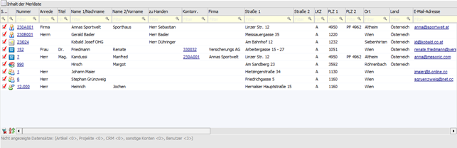 In den weiteren Spalten werden die Stammdaten der Adresse dargestellt. Die folgenden Spalten werden hierbei ausschließlich bei Ansprechpartnern und Kontakten mit Informationen gefüllt.