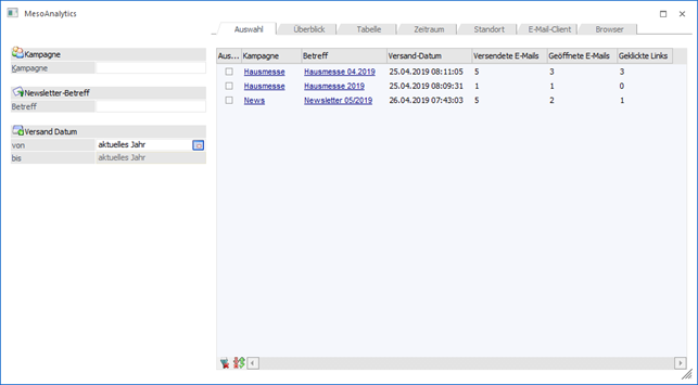 Durch Anklicken des Buttons "Anzeigen/Aktualisieren" (bzw. durch das Drücken der Taste F5) werden die MesoAnalytics-Sendungen im Analyse-Bereiche (aufgrund der dort getätigten Selektion) angezeigt, bzw. werden die Spalten "Kampagne", "Betreff" und "Versand-Datum" im Register "Auswahl" gefüllt.