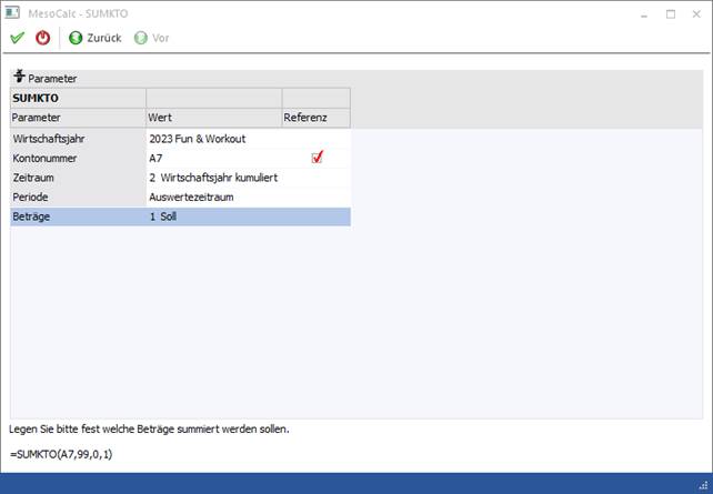Beispiel: SUMKTO mit einer Referenz auf die Zelle A7, es wird der SOLL-Wert für das WJ ermittelt.