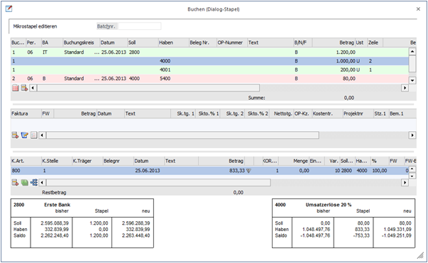 Wenn der Mikrostapel abgearbeitet ist, kann durch die einmalige Buchungsbetätigung mit der F5-Taste im Buchungsfenster noch weitere Buchungszeilen erfasst werden. Erst bei der zweiten Bestätigung des OK-Buttons wird der gesamte Buchungsbeleg (Mikrostapel und einzeilige Buchungszeilen) ins Journal geschrieben.