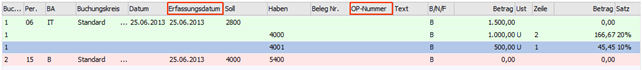 Abhängig von den Einstellungen in den FIBU-Parametern, wird das Feld "OP-Nummer" und/oder die Spalte "Erfassungsdatum" in der Tabelle angezeigt oder nicht. Wird das Feld bzw. die Spalte angezeigt, ist es auch editierbar. Wenn in der Buchungsart definiert ist, dass das Feld "Belegnummer" aus der Hauptzeile in eine andere Zeile des Mikrostapels übernommen werden soll, wird auch die "OP-Nummer" mitübernommen.