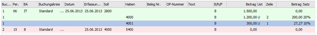 Die Vorbelegungen aus dem Mikrostapeln werden sofort beim Füllen der Tabelle übernommen, alle Eingaben, die abhängig von einem Wert in der ersten Zeile sind, werden erst übernommen, wenn der Fokus erstmals in die Zeile gesetzt wird. Wird ein Wert in der ersten Zeile geändert, werden alle weiteren Zeilen wieder auf "nicht bearbeitet" gesetzt. Man kann sich aber innerhalb der Zeile frei bewegen, um z.B.: die Steuerzeile oder den Steuerbetrag zu editieren.