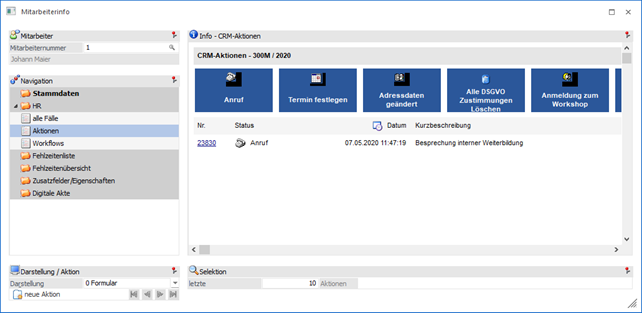 In der Ansicht "Aktionen" werden CRM Fälle des Typs "CRM Aktion" angezeigt, welche für den Mitarbeiter erfasst wurden. Die Darstellung kann hierbei in Form einer Formularansicht oder als Tabelle erfolgen.