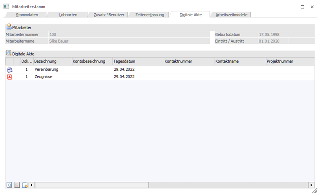 In dem Register "Digitale Akte" werden sämtliche Archivdokumente des Mitarbeiters bzw. Bewerbers angezeigt.