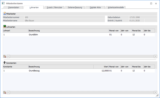 In dieser Tabelle können Konstanten verwalten werden, die für die automatische Berechnung von Lohnarten verwendet werden können. Dies kann z.B. der monatliche Grundbezug, ein Sachbezug oder dergleichen sein. Die aktuell gültigen Konstanten werden fett dargestellt, sodass man sie leichter erkennen kann. Für Mitarbeiter haben die Konstanten keine Funktion, außer dass man die Werte erfassen und nachsehen kann.