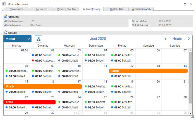 In dem Register "Zeitenerfassung" werden die Fehlzeiten des Mitarbeiters in Form einer Kalenderansicht angezeigt.