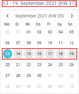In der Mitte des Kalenders wird der aktuell dargestellte Zeitraum ausgegeben. Durch Anwahl dieser Information wird ein Minikalender zur schnellen Navigation geöffnet. Der aktuelle Tag wird in hellblau und die aktuelle Woche in grau dargestellt.