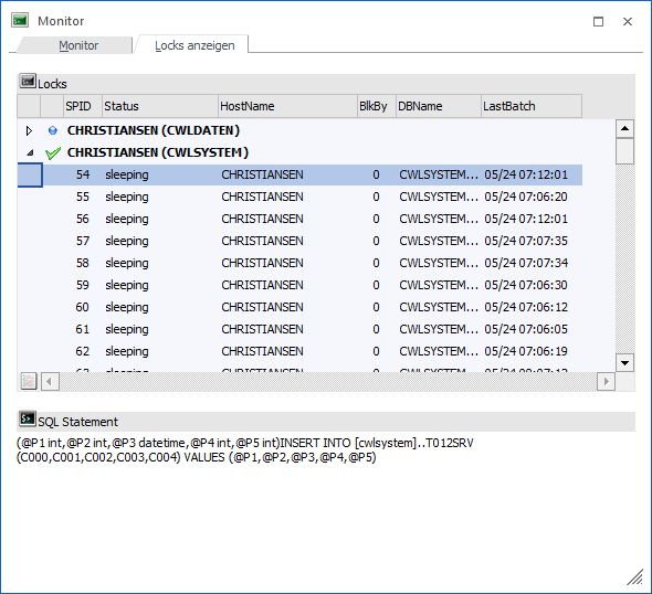 In der Tabelle werden alle SQL-Prozesse/Locks angezeigt. Durch Anwahl einer Zeile wird im Bereich "SQL Statement" das zugehörige Statement angezeigt.