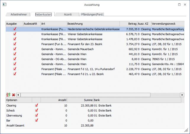 Im Register Nebenkosten können die Lohnnebenkosten (Krankenkasse, Finanzamt, Gemeinde) an die entsprechenden Stellen ausgezahlt werden. Voraussetzung dafür ist, dass im Betriebsstamm die Empfänger-Stämme der jeweiligen Stellen angelegt wurden. Dabei ist zu beachten, dass auch die BLZ und die Kontonummer entsprechend hinterlegt wurden. Die Bildung der Daten für die Auszahlung erfolgt über den Menüpunkt