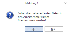 Durch Anklicken des Speichern-Buttons wird die erfasste Meldung zur Ausgabe berücksichtigt. Gleichzeitig können geänderte Werte in die Stammdaten rückgeschrieben werden. Dies wird vom Programm abgefragt: