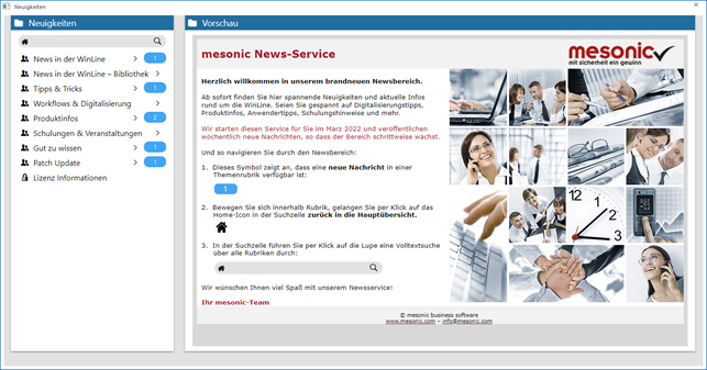 Im Fenster "Neuigkeiten" werden wichtige Information zur WinLine präsentiert. Das Öffnen des Fensters kann wie folgt erfolgen: