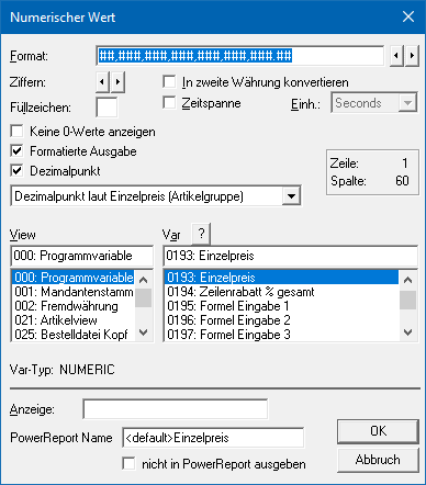 Numerische Variablen ermöglichen den Andruck von Variablen, in denen eine Zahl (z.B. ein Einzelpreis) gespeichert sind. Hierfür stehen unterschiedlichste Formatierungen zur Verfügung.