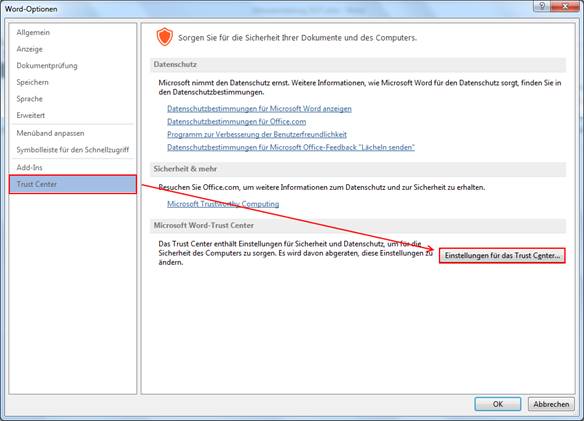 Bereich "Trust Center" gewählt und dort der Buttons "Einstellungen für das Trust