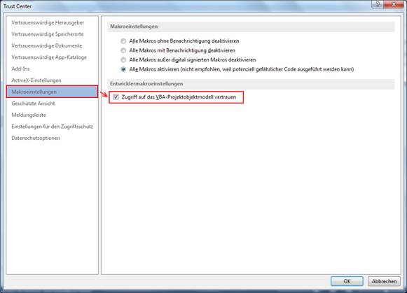Makroeinstellungen die Option "Zugriff auf das VBA-Projektobjektmodell