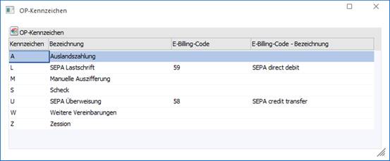 Dem OP-Kennzeichen kann ein E-Billing-Code aus der Liste "Payment" zugewiesen werden. Die Listen befinden sich im Menüpunkt FAKT/Stammdaten/Belegaustausch/E-Rechnung–Codelisten.