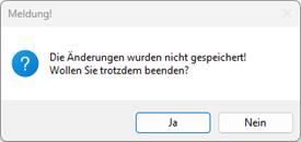 Das Programm wird verlassen und alle Eingaben bzw. Änderungen werden verworfen. Beim Beenden wird geprüft, ob nicht gespeicherte Änderungen vorhanden sind und vor dem Schließen erfolgt eine Sicherheitsabfrage.