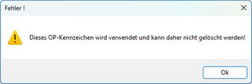 Wenn das Kennzeichen bereits gespeichert ist, wird die Zeile lediglich zum Löschen markiert und eingefärbt. Wenn es sich um ein neues Kennzeichen handelt, wird dieses direkt aus der Bildschirmtabelle gelöscht. Stellt das Programm fest, dass das OP-Kennzeichen bereits verwendet wurde, erscheint eine Hinweismeldung, dass das Kennzeichen nicht gelöscht werden kann.