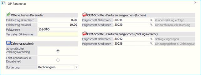Die OP-Parameter werden einerseits für die Stapelbuchungsschnittstelle benötigt, da über die Stapelbuchungen auch Zahlungen eingelesen werden können. Andererseits können darin CRM-Folgeschritte hinterlegt werden.