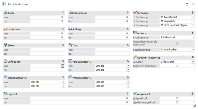 Die Ausgabe der Packliste kann durch folgende Kriterien eingeschränkt bzw. beeinflusst werden: