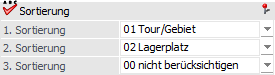 An dieser Stelle kann die Sortierung der Packliste definiert werden, wobei eine 3-stufige Sortierung möglich ist (z.B. wird eine Packliste pro Kunde benötigt, in welcher wiederum nach Lagerorten und Aufträgen sortiert wird). Folgende Kriterien stehen hierbei zur Verfügung: