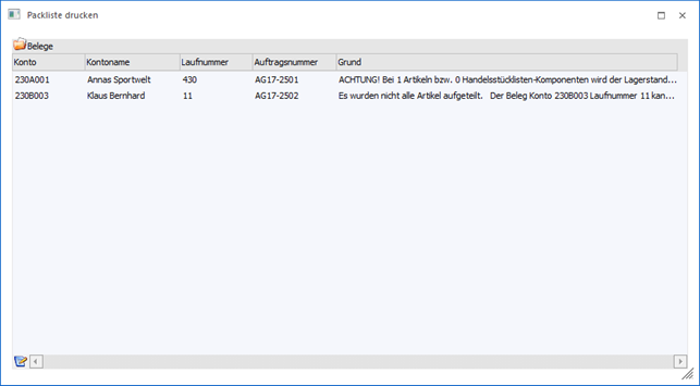 Sobald ein Beleg gespeichert wird und damit der Fehlerfall behoben ist, wird dieser Beleg aus der Tabelle im Packlistenfenster entfernt. Sind alle Belege bearbeitet bzw. korrigiert, wird der Packlistendruck nochmals automatisch gestartet.
