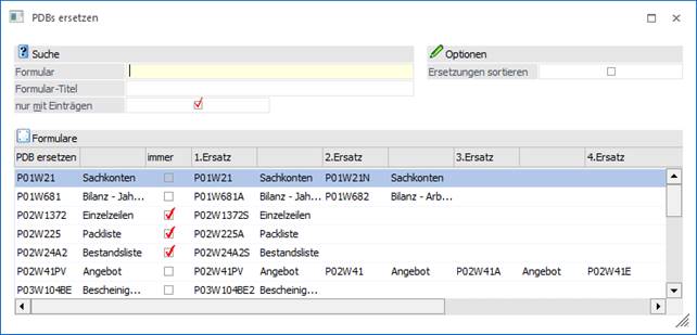 Über das Eingabefeld "Formular" kann nach einer Formularbezeichnung (PDB-Datei) gesucht werden.