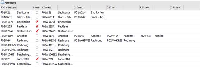In den Spalten 1. Ersatz bis 5. Ersatz können die entsprechenden Ersatz-/ Alternativformulare hinterlegt werden.