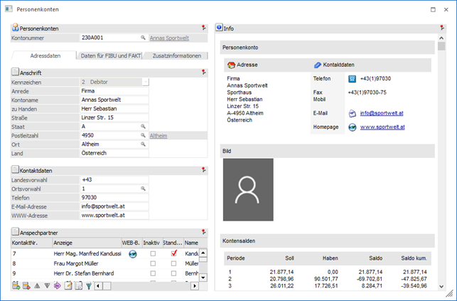 Durch Anklicken des Buttons "Konteninfo" werden alle Informationen zu diesem Konto angezeigt. Wenn zusätzlich zum Anklicken die SHIFT-Taste gedrückt wird, so gelangt man in die Kunden- bzw. Lieferanteninformation. Dies ist auch über den Shortcut (SHIFT + ALT + I) möglich.