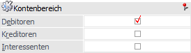 Wird neben der Option Interessent z.B. auch die "Debitoren" aktiviert, so werden neben den Kundenkonten nur die Interessenten des Typs "Kunden" ausgegeben. Bei der Aktivierung von "Kreditoren" und "Interessenten" hingegen nur Interessenten des Typs "Anfragelieferanten".