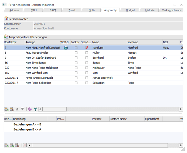 Im Register "Ansprechp." des Personenkontenstamms werden Ansprechpartner und Beziehungen des Kontos verwaltet.