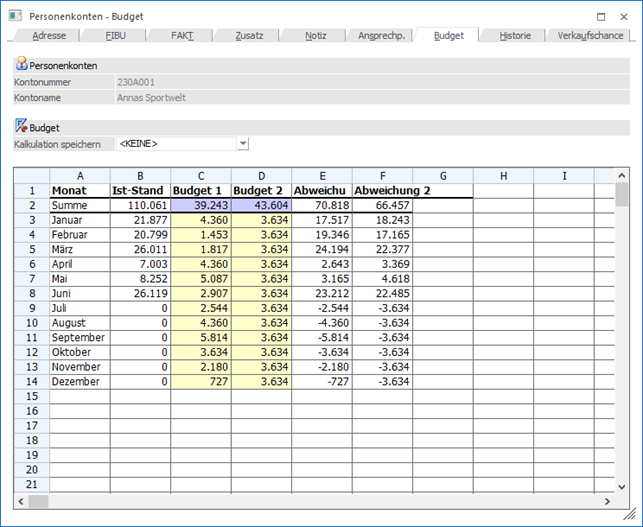In den Spalten "Budget I" und "Budget II" können zwei Budgetansätze hinterlegen, wobei die Eingabe der Budgetwerte global für das gesamte Jahr erfolgen kann. Hierbei würde der Jahreswert automatisch auf die einzelnen Monate umgelegt werden. Nicht durch 12 teilbare Werte werden auf die Monate aufgeteilt.