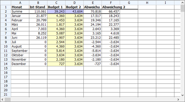 In den nachfolgenden Spalten "Abweichung I" und "Abweichung II" wird die - mittels Formel - automatisch vom Programm berechnete Abweichung zwischen den IST-Werten und den Budgetansätzen ausgewiesen.