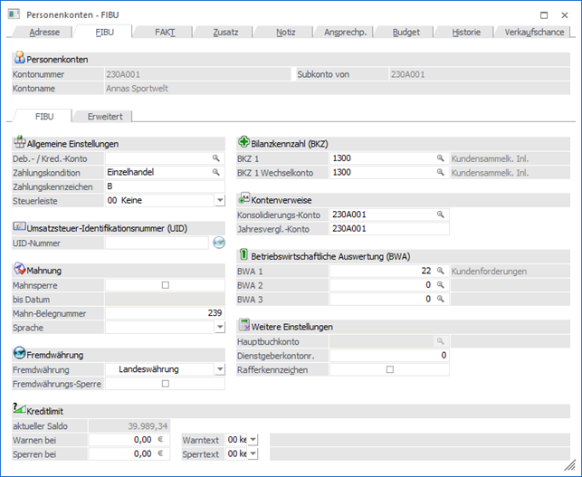 In dem Register "FIBU" des Personenkontenstamms werden alle wesentlichen Informationen verwaltet, welche speziell die Finanzbuchhaltung betreffen. Die Informationen sind auf die Unterregister "FIBU" und "Erweitert" aufgeteilt.