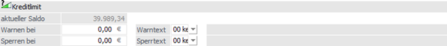 Aus der Auswahlliste kann ein beliebiger Warntext ausgesucht werden. Die Warntexte können in der WinLine FAKT über "Stammdaten - Kreditlimittexte" angelegt werden. Wird ein Warntext >= 01 hinterlegt, wird dieser Warntext bei jeder Erfassung eines Beleges angezeigt! Dadurch wird der Wert "Warnen bei" nicht mehr bearbeitbar.