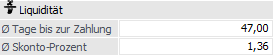 In diesem Feld wird der durchschnittliche Skonto-Prozentsatz hinterlegt, der bei den Rechnungen in Abzug gebracht wird. Dieser Wert wird für die Berechnung in der Liquiditätsanalyse benötigt.
