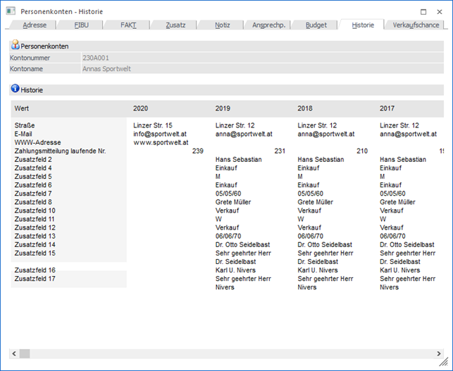 Sofern die Mandanten mit Mehrjahresinformationen geführt werden, wird in dem Register "Historie" des Personenkontenstamms der "Verlauf" von Konten angezeigt.