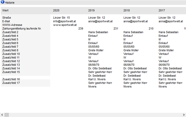 Hier werden alle Werte angezeigt, die sich im Laufe der Wirtschaftsjahre verändert haben und auch im Stammdatenfenster eingegeben werden können.