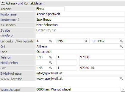 Zusätzlich wird auch das Kennzeichen "Adresse vom Konto verwenden" gesetzt, d.h. die Adressfelder können im Register "Ansprechpartner" nicht mehr editiert werden, werden allerdings automatisch aktualisiert, sobald die Adresse des Kontos geändert wird.