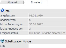 In dem Unterregister "Erweitert" kann u.a. die GLN hinterlegt werden. Zusätzlich stehen Infos z.B. zur Anlage zur Verfügung.