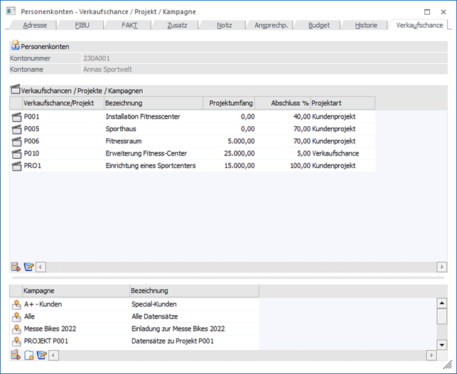 Im Register "Verkaufschance" des Personenkontenstamms werden die Verkaufschancen bzw. Projekte (Kunden-, sowie Serviceprojekte) und Kampagnen des Kontos angezeigt und können direkt editiert werden.