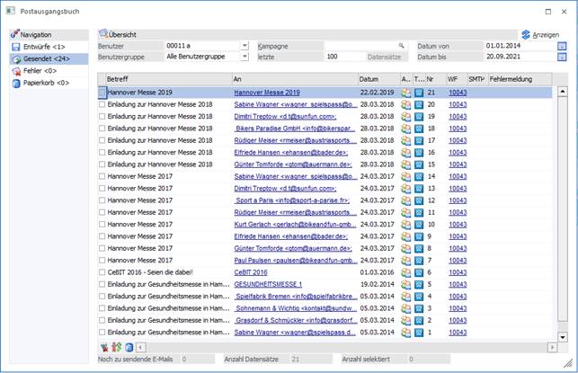 Das Postausgangsbuch zeigt eine Übersicht über die durchgeführten Aktionen. Die Navigation im Postausgangsbuch erfolgt über den linken Navigationsbereich mit den Einträgen: