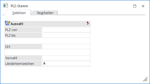 In jedem Feld, in dem eine Postleitzahl bzw. ein Ort eingegeben werden kann, kann durch Drücken der F9-Taste der Postleitzahlen Matchcode aufgerufen werden.